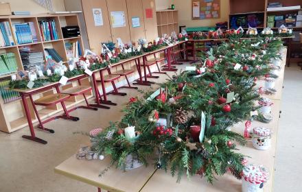 Dienstag und Mittwoch werkelten alle Schüler in kleinen Gruppen. Mit vielen Helfern entstanden schöne, weihnachtliche Dinge, wie Kränze, Sterne, Häuschen, Windlichter und ähnliches.